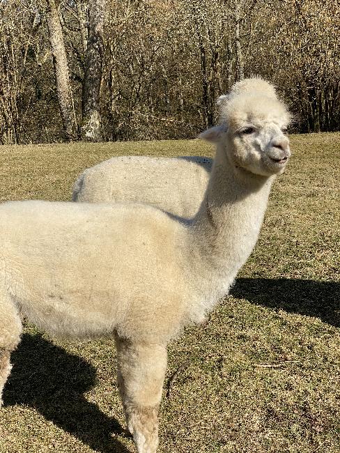 Lernen Sie Anastasia kennen, eine wunderschöne zweijährige weiße Alpaka-Stute mit beeindruckender Vliesproduktion.